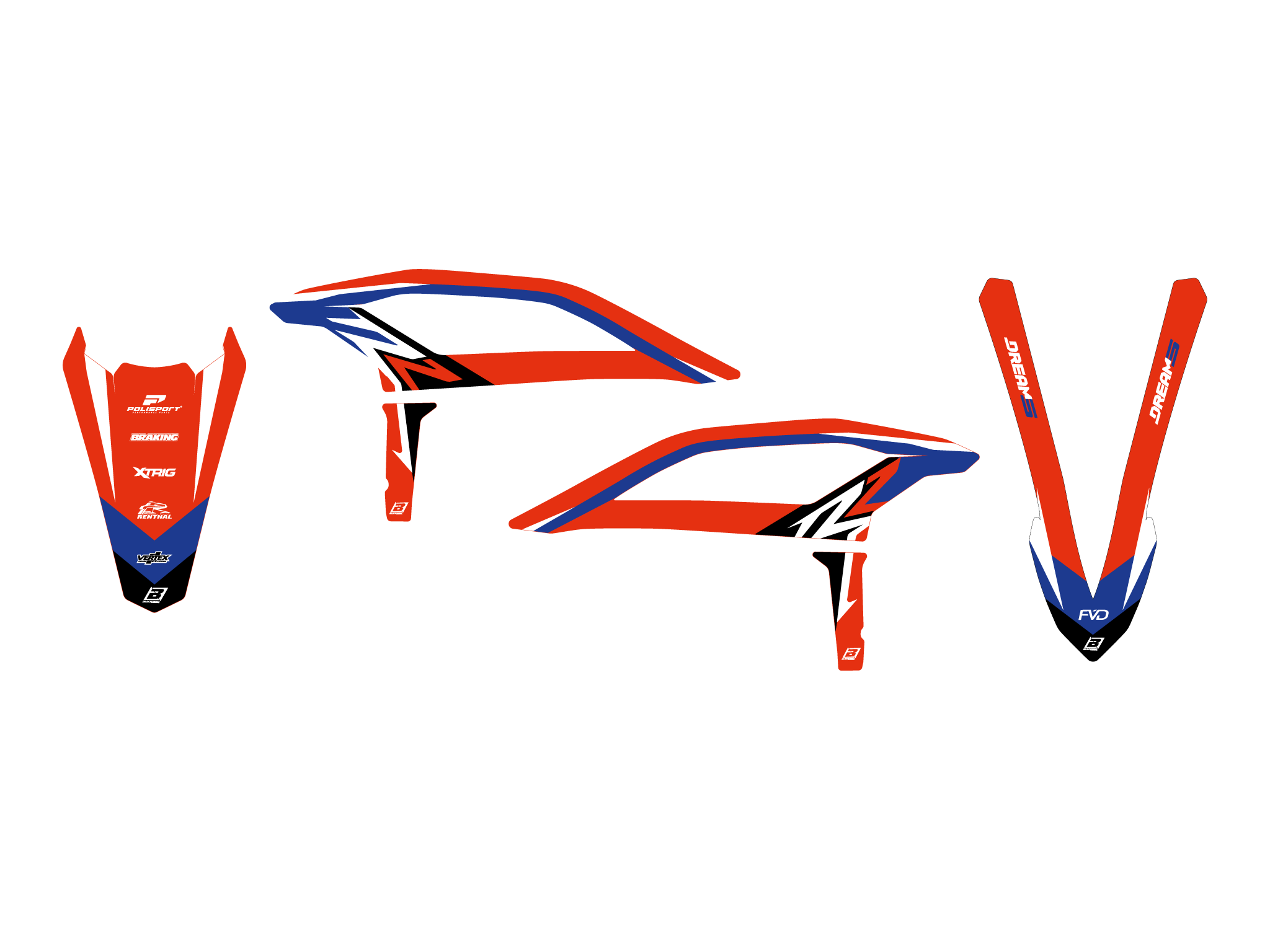 Each kit includes all the main parts: radiator shrouds, fenders, airboxes, number tables, swingarm.