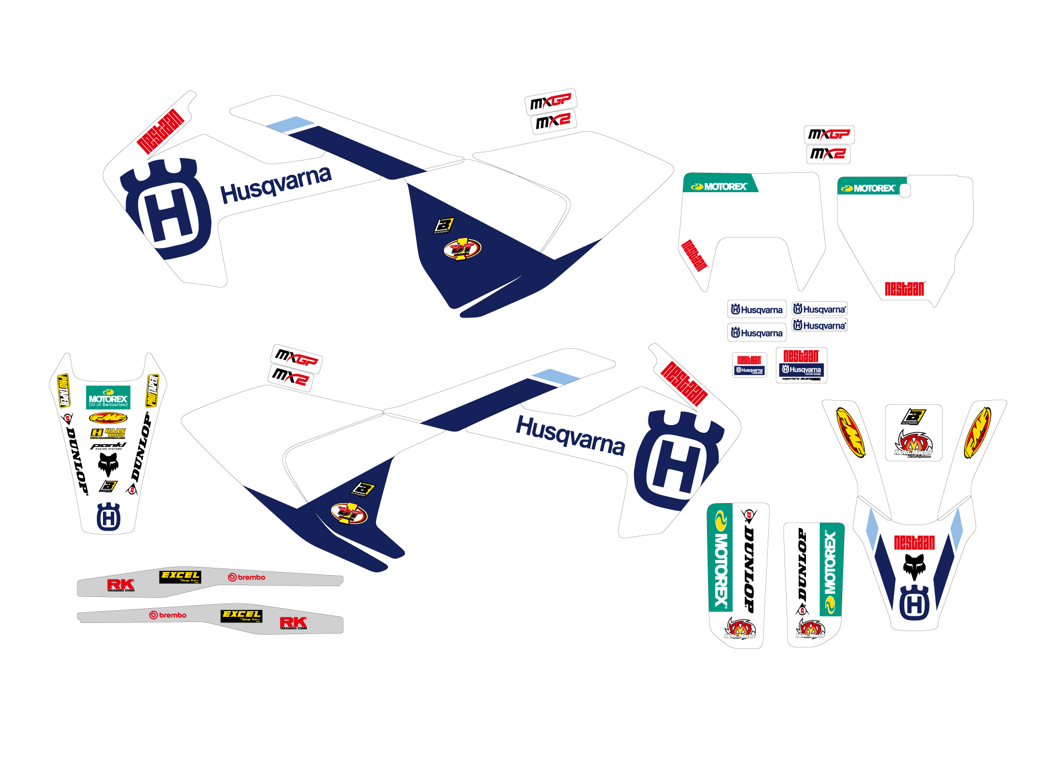 Each kit includes all the main parts: radiator shrouds, fenders, airboxes, number tables, swingarm.