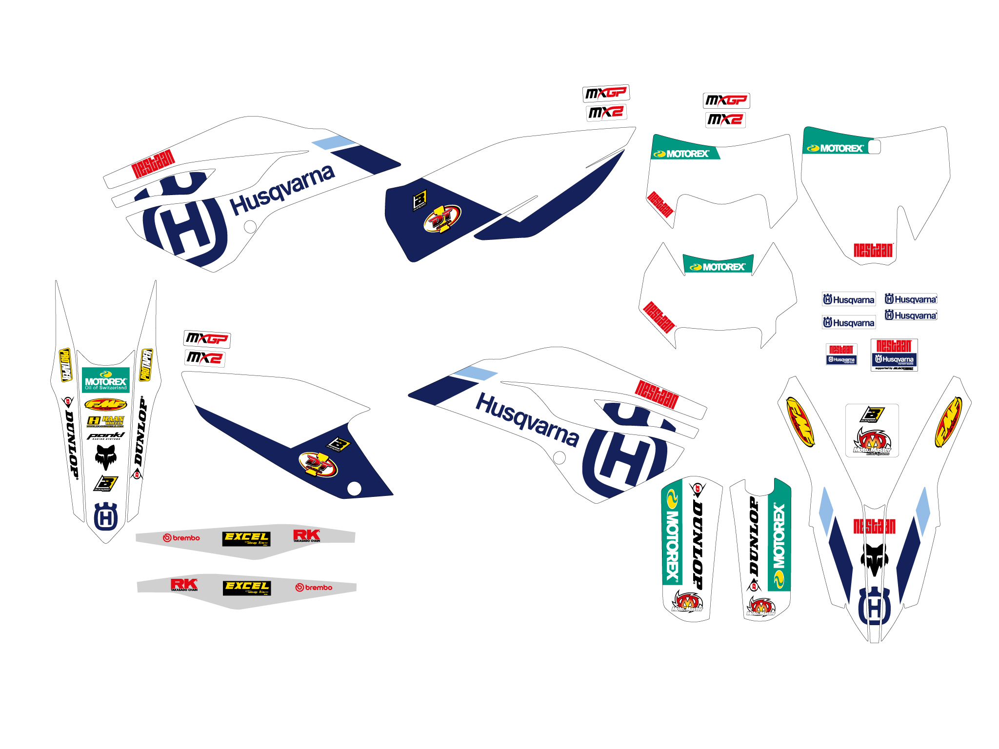 The sticker kit includes: radiator shrouds pair, airbox pair, fork protections pair, swing arm pair, front fender, rear fender and Motocross and Enduro plates . The different pieces of the kit cannot be sold separately. A unique limited edition graphic.