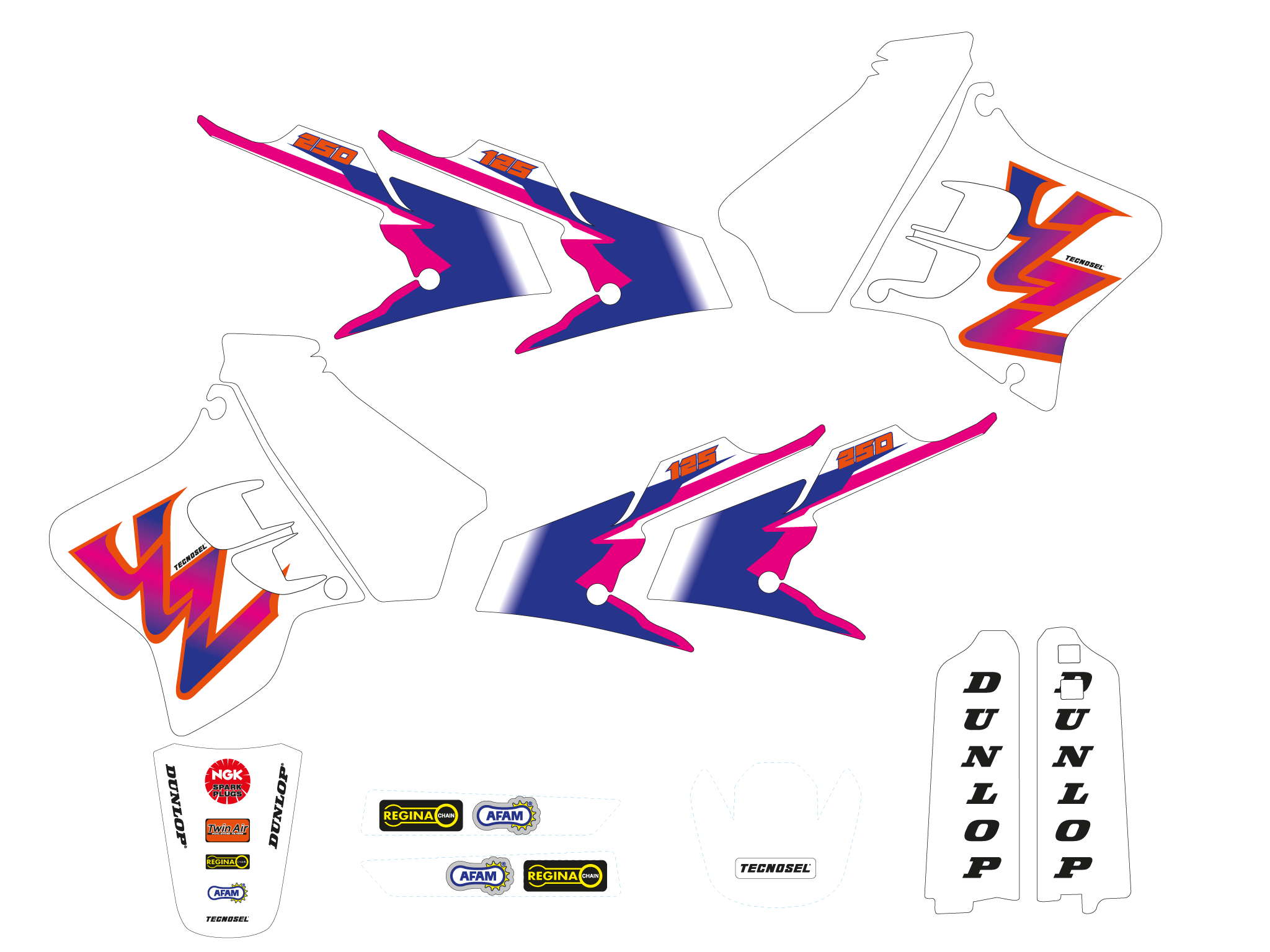Each kit includes all the main parts: radiator shrouds, fenders, airboxes, number tables, swingarm.