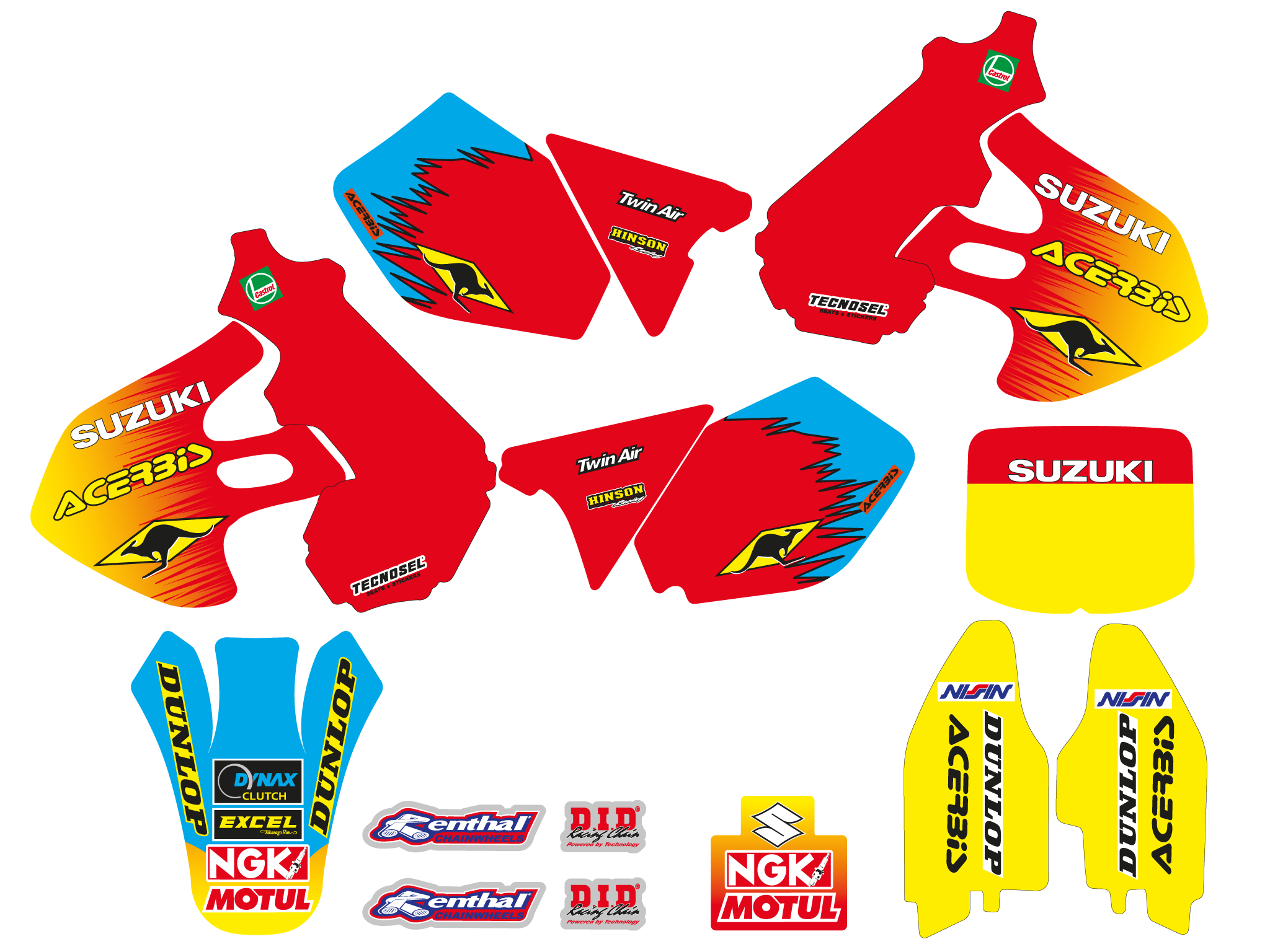 Each kit includes all the main parts: radiator shrouds, fenders, airboxes, number tables, swingarm.