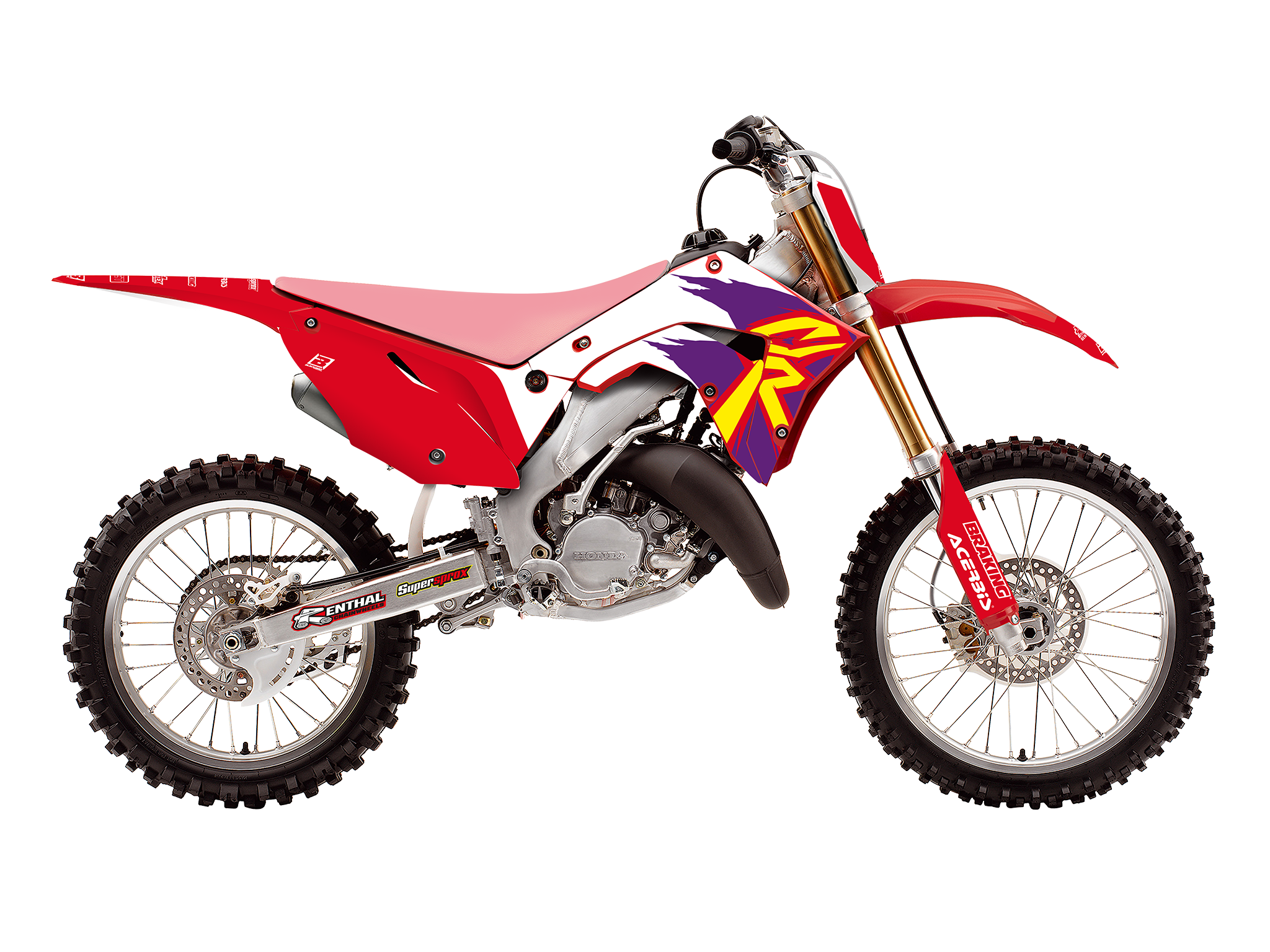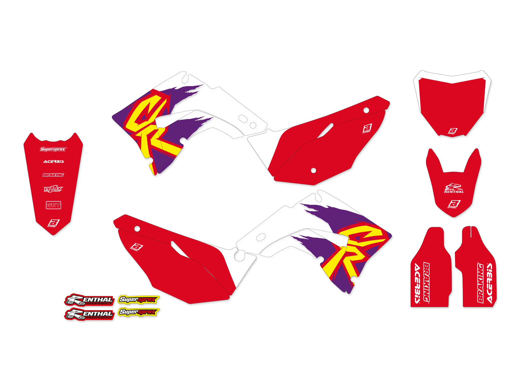 Le kit autocollants comprend : paire ouïes de radiateur, paire boîte à air, paire protections de fourche, paire bras oscillant, garde-boue avant, garde-boue arrière et fond de plaque motocross et enduro. Les différentes pièces qui composent le kit ne peuvent pas être vendues séparément.
