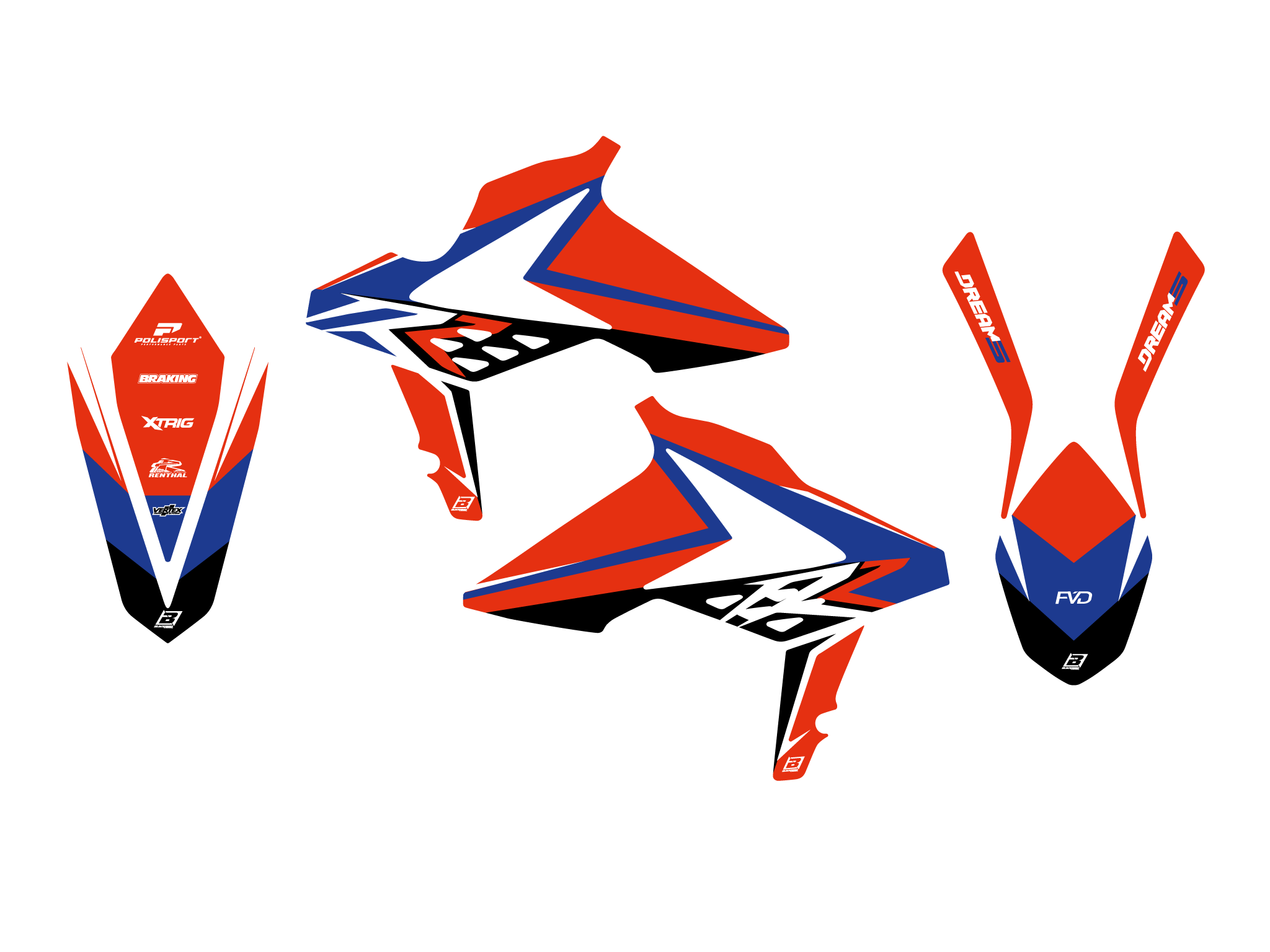 Ogni kit include tutte le parti principali: convogliatori, parafanghi, airbox, tabelle, forcellone.