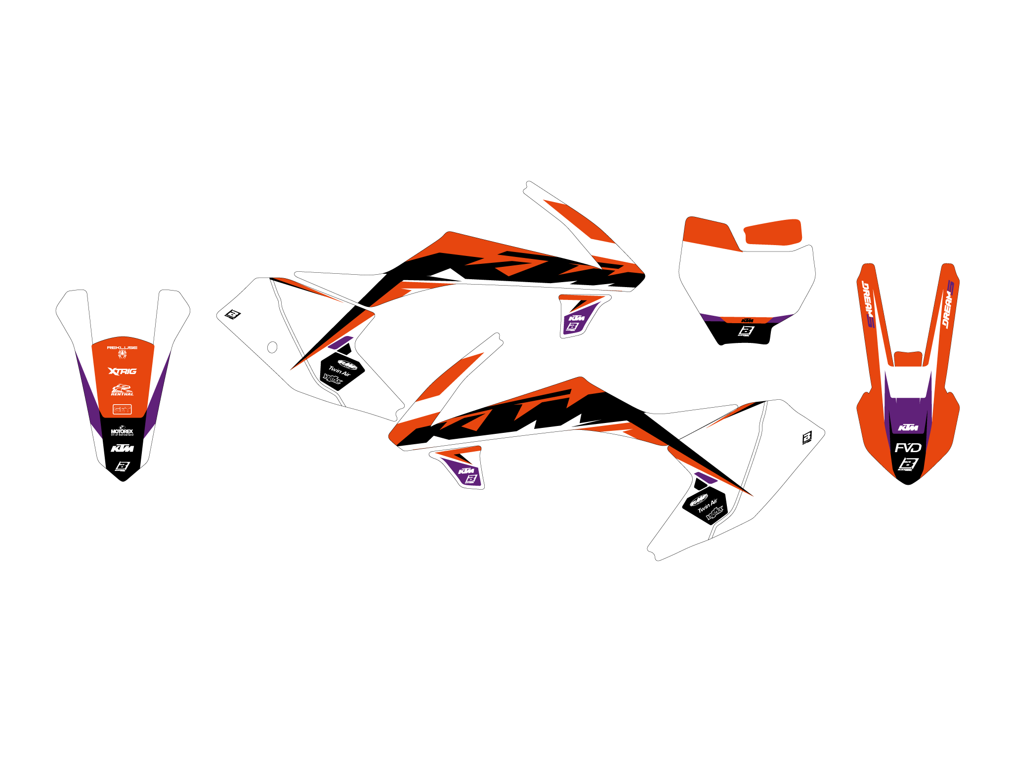Ogni kit include tutte le parti principali: convogliatori, parafanghi, airbox, tabelle, forcellone.