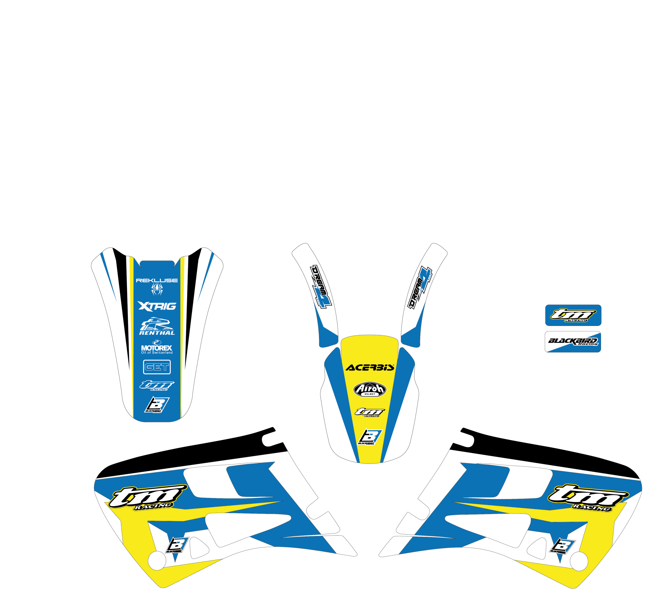 Ogni kit include tutte le parti principali: convogliatori, parafanghi, airbox, tabelle, forcellone.