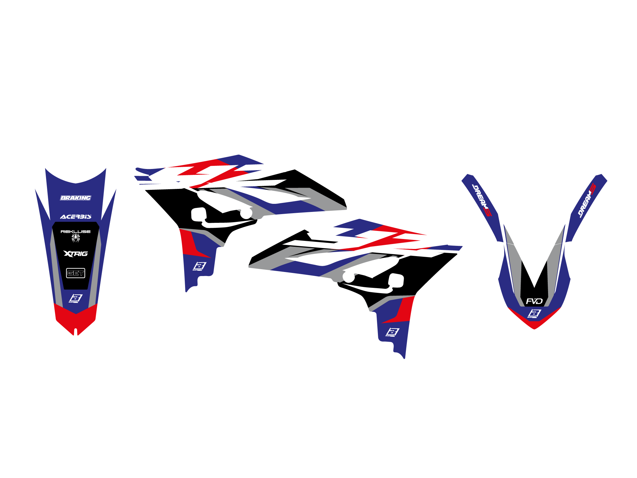 Ogni kit include tutte le parti principali: convogliatori, parafanghi, airbox, tabelle, forcellone.