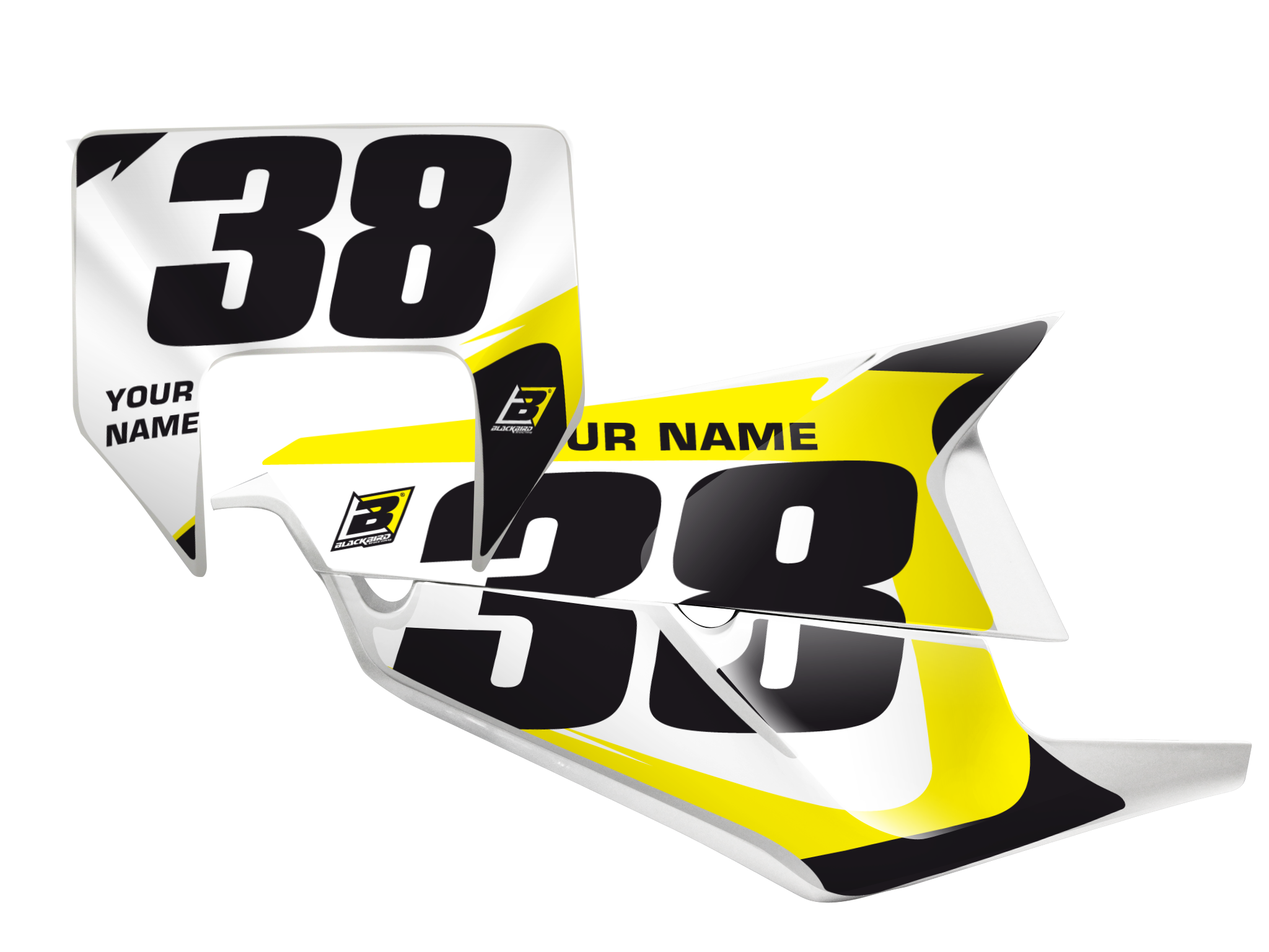 Le tabelle portanumero Blackbird Racing sono realizzate in PVC e materiali plastici ad alta resistenza, progettati per sopportare urti, fango e lavaggi frequenti senza scolorire.