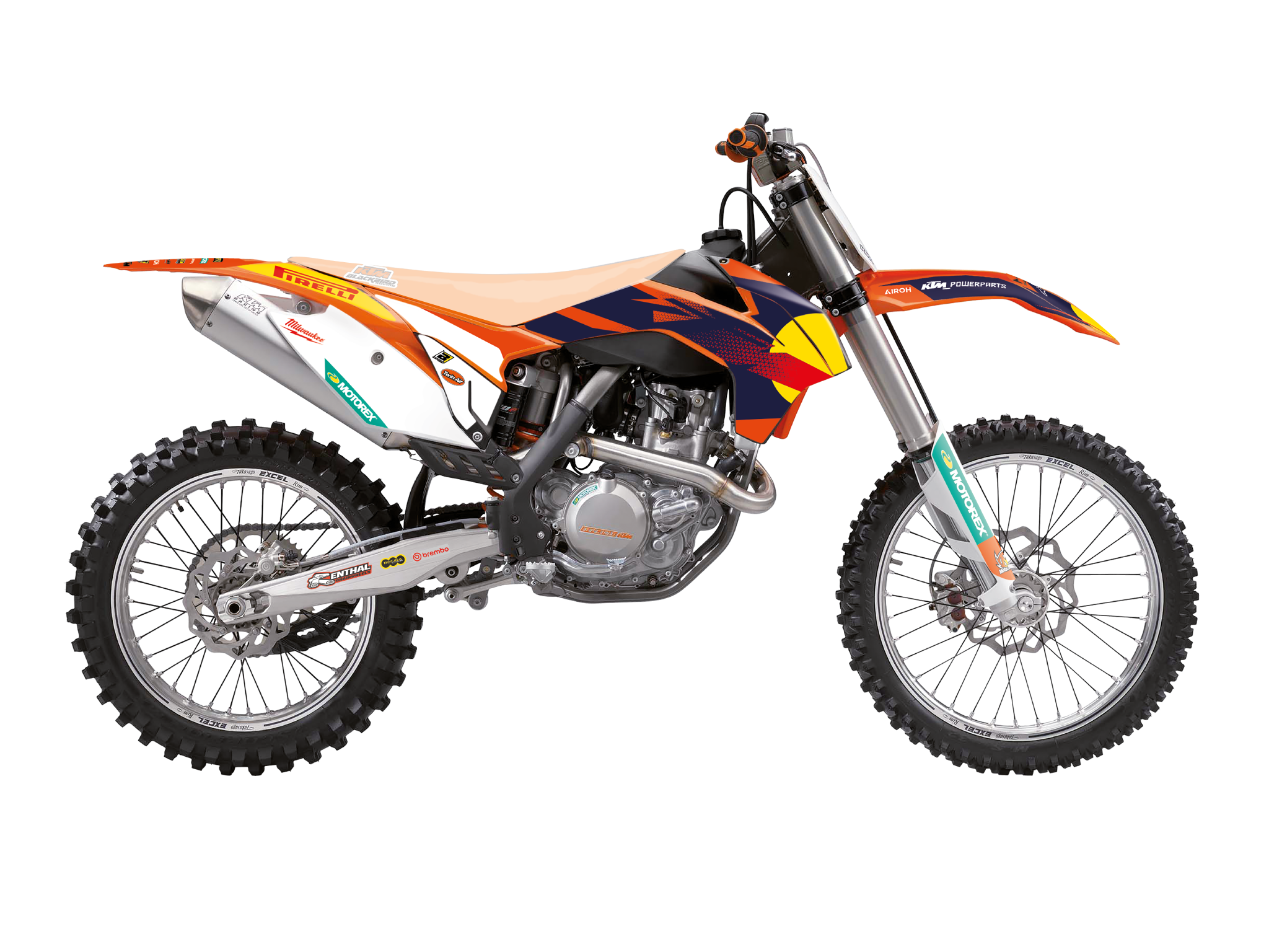 Il kit adesivi include: coppia convogliatori, coppia cassa filtro, coppia parasteli, coppia forcellone, parafango anteriore, parafango posteriore e tabelle portanumeri. I vari pezzi che compongono il kit non possono esser venduti separatamente. Una grafica unica direttamente dai team ufficiali del campionato Mondiale di Motocross.