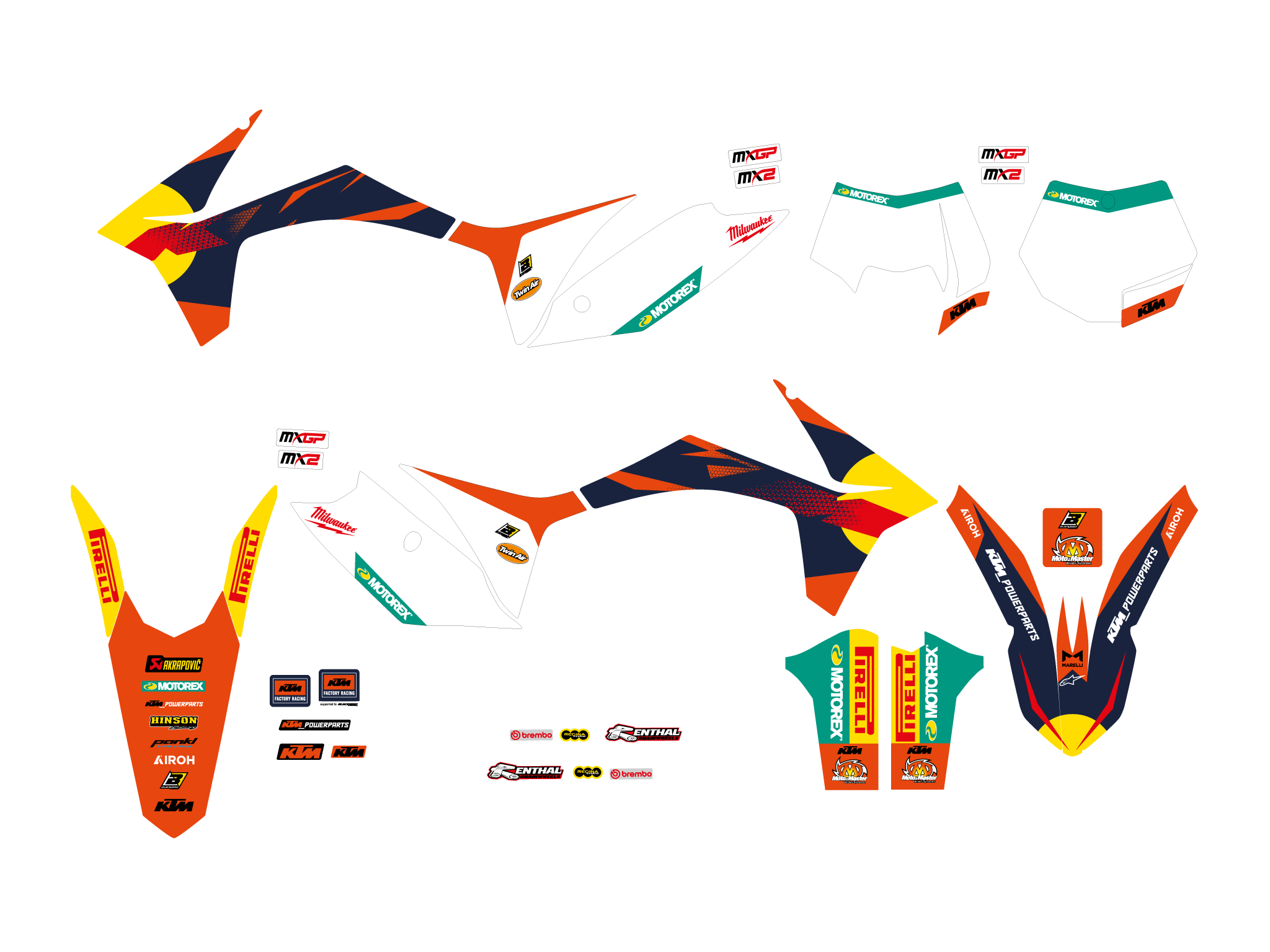 Ogni kit include tutte le parti principali: convogliatori, parafanghi, airbox, tabelle, forcellone.