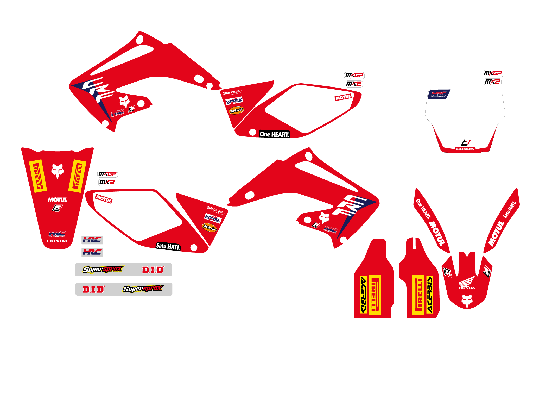 Ogni kit include tutte le parti principali: convogliatori, parafanghi, airbox, tabelle, forcellone.