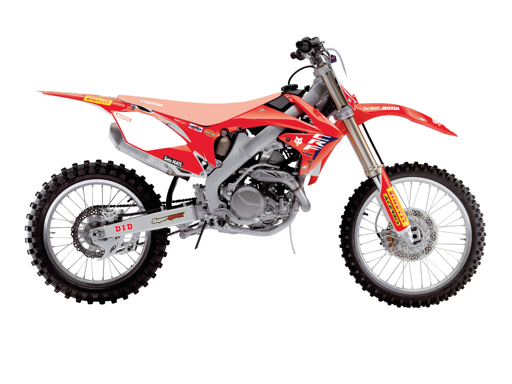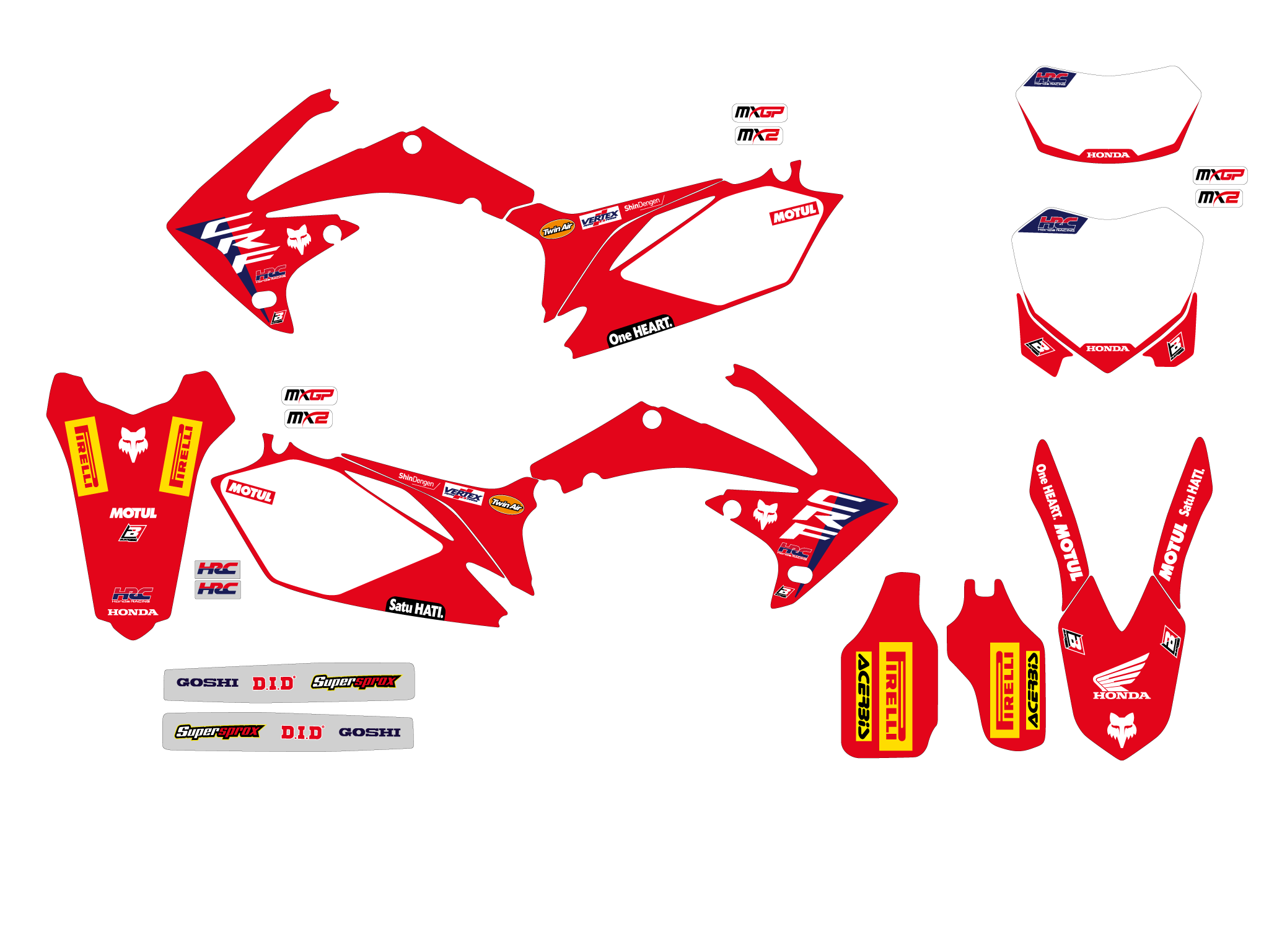 Il kit adesivi include: coppia convogliatori, coppia cassa filtro, coppia parasteli, coppia forcellone, parafango anteriore e parafango posteriore e tabelle portanumero. I vari pezzi che compongono il kit non possono esser venduti separatamente. Una grafica unica direttamente dai team ufficiali del campionato Mondiale di Motocross. Tabella anteriore 2008-2009