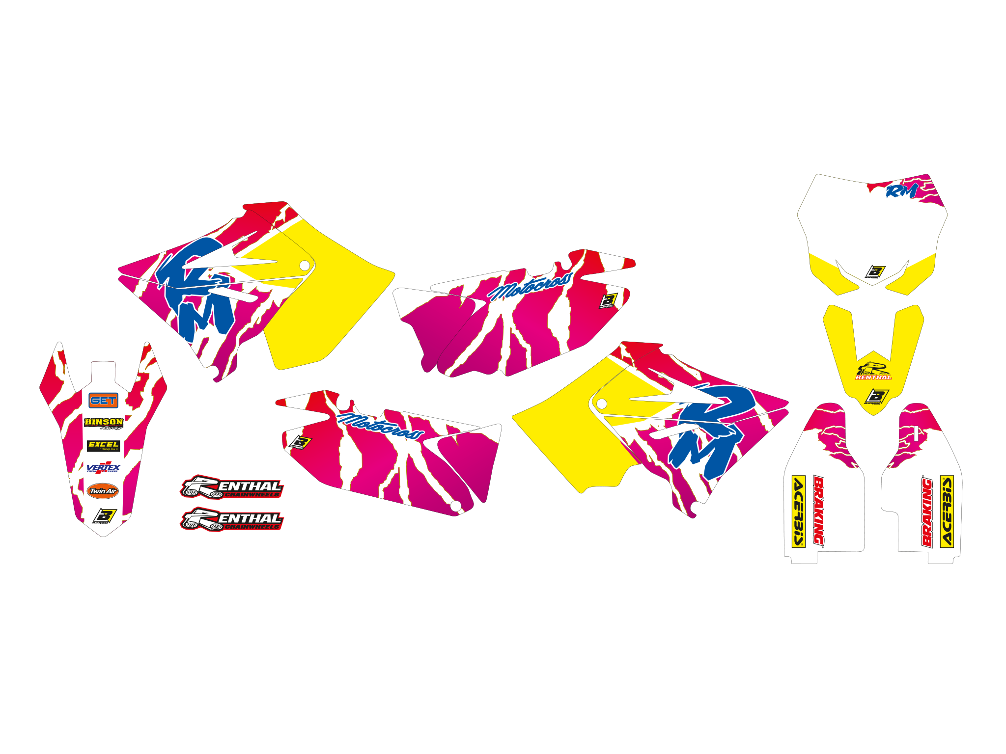 Ogni kit include tutte le parti principali: convogliatori, parafanghi, airbox, tabelle, forcellone.